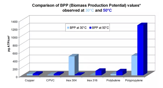 Source: Study of 6 different materials used for drinking water distribution and their capacity to support bacterial growth conducted by Crecep (Research and Control of drinking water Centre in Paris) according to a European standard project by means of the Biomass Production Potential test in 2005.