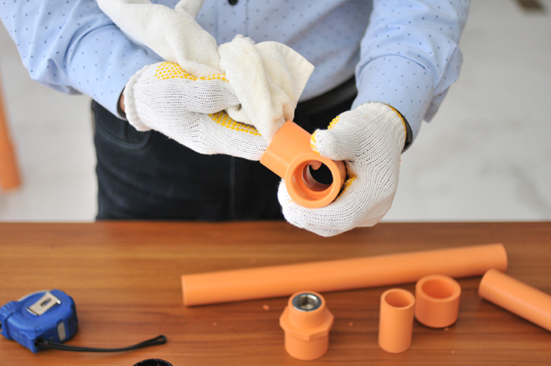 分别在管道表面、管件内壁均匀涂抹粘胶剂。